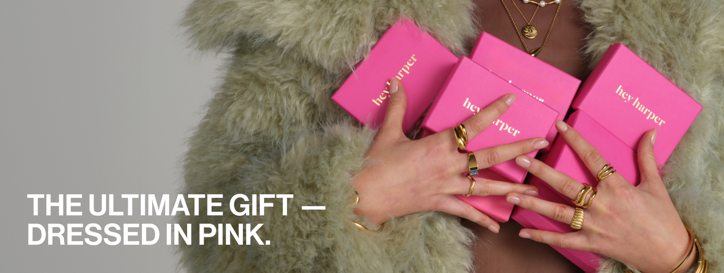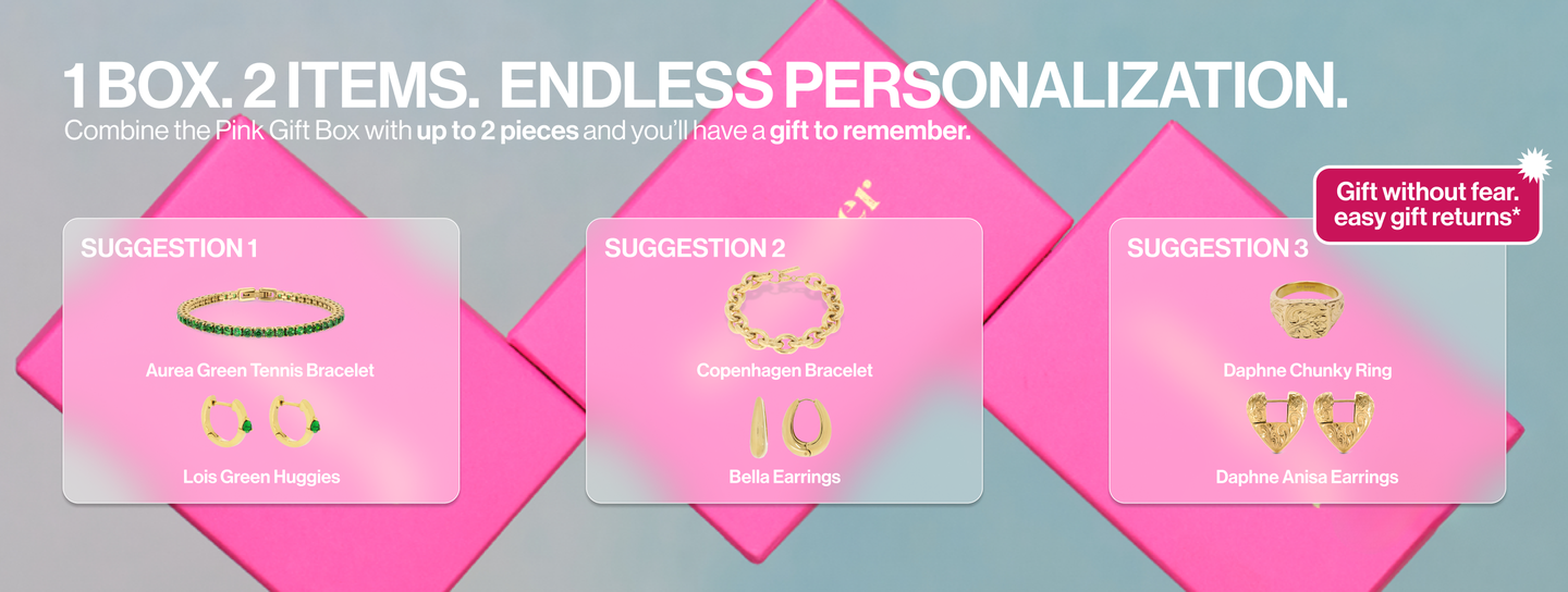 Wrap your love in our iconic Pink Gift Box! This holiday packaging is perfect for creating a personalized jewelry bundle, fitting up to two pieces of your choice for that curated touch. With a soft pink exterior and beautifully crafted details, this box transforms any gift into an extraordinary experience. Check our FAQs for more information.
